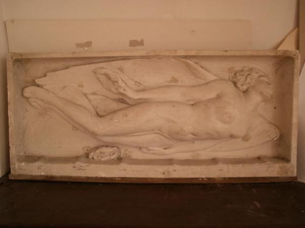 Rappresentazione plastica in gesso di una donna - angelo con corone d'alloro.
