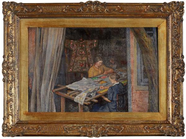 - NOTIZIE STORICO CRITICHE Dipinto dell’ultima fase di Bucci che ritrova l’intimità e gli incontri del quotidiano nella città d’adozione. Sullo sfondo della stanza, traguardata da una finestra con tende scostate, si vede un lavoro finito uscito dalle mani sapienti delle donne: una pianeta per sacerdote riccamente ricamata su fondo bianco, da cerimonia festiva.