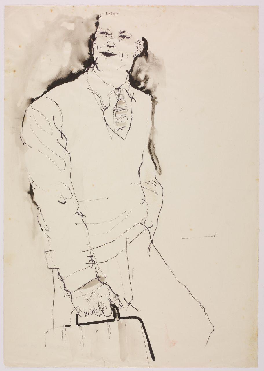 Bozzetto per l'illustrazione del pieghevole pubblicitario "Lettera allo studente" della società Olivetti. uomo con valigetta