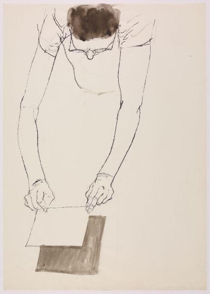 Bozzetto per l'illustrazione del pieghevole pubblicitario "Lettera allo studente" della società Olivetti. uomo, visto dall'alto, con foglio di carta tra le mani