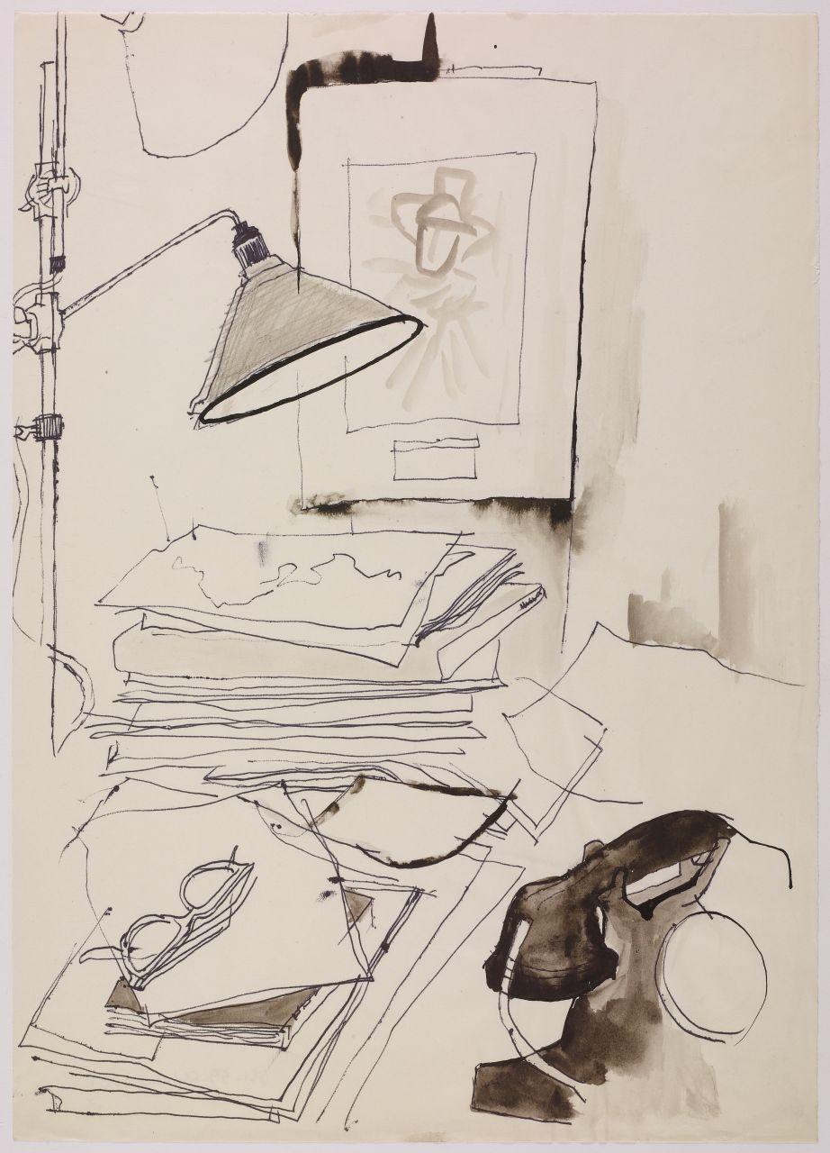 Bozzetto per l'illustrazione del pieghevole pubblicitario "Lettera allo studente" della società Olivetti. particolare di una scrivania con abat-jour, telefono, occhiali e fogli di carta impilati