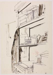 Bozzetto per l'illustrazione del pieghevole pubblicitario "Lettera allo studente" della società Olivetti. particolare di uno scaffale con libri, giacca e oggetti vari