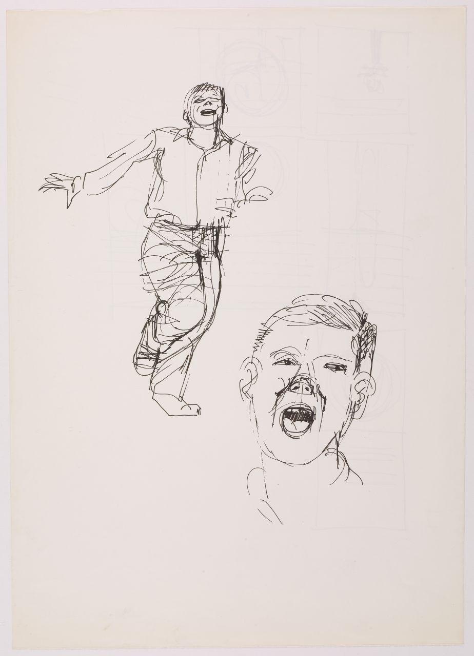 Bozzetto per l'illustrazione del pieghevole pubblicitario "Lettera allo studente" della società Olivetti. ragazzo in movimento e volto con bocca aperta