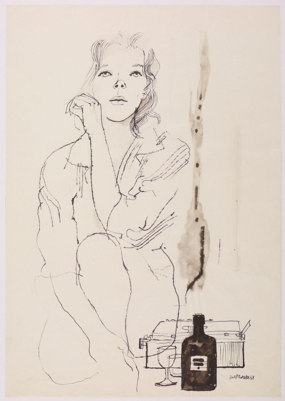 Bozzetto per l'illustrazione del pieghevole pubblicitario "Lettera allo studente" della società Olivetti. ragazza accovacciata con macchina da scrivere, bottiglia e bicchieri