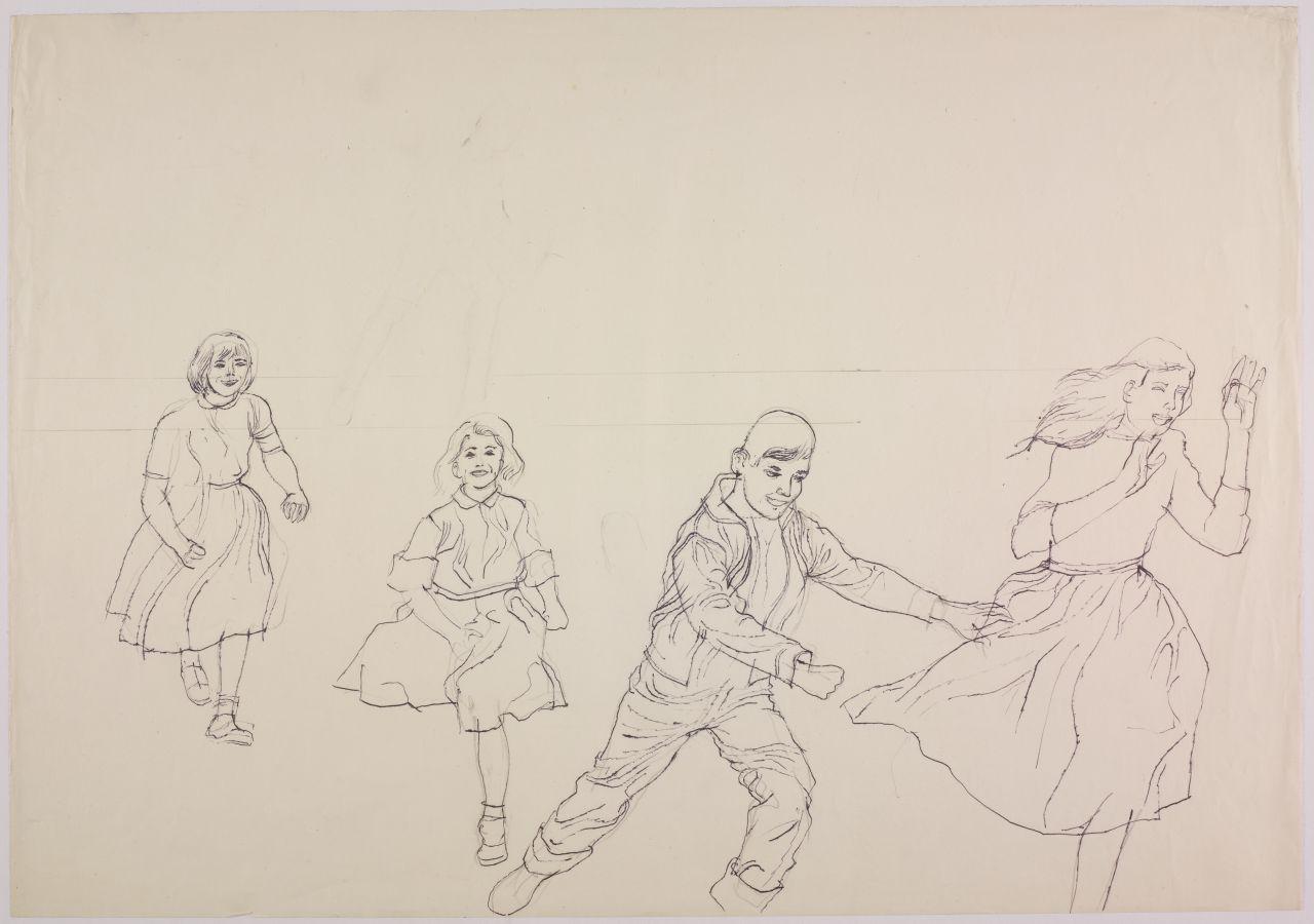 Bozzetto per l'illustrazione del pieghevole pubblicitario "Lettera allo studente" della società Olivetti. figure umane in movimento