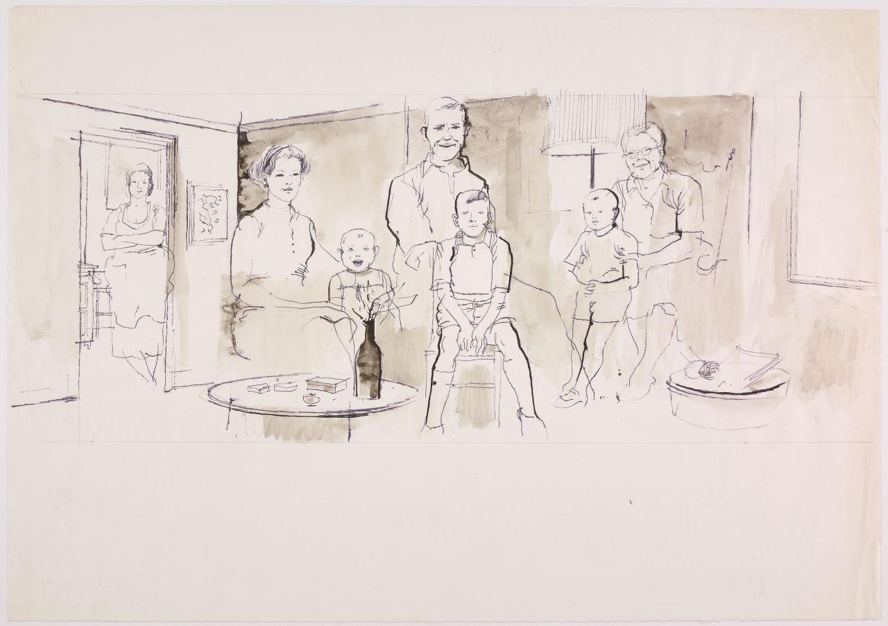 Bozzetto per la realizzazione di un pannello espositivo per la XXV Mostra Radio e Televisione. famiglia all'interno di un'abitazione