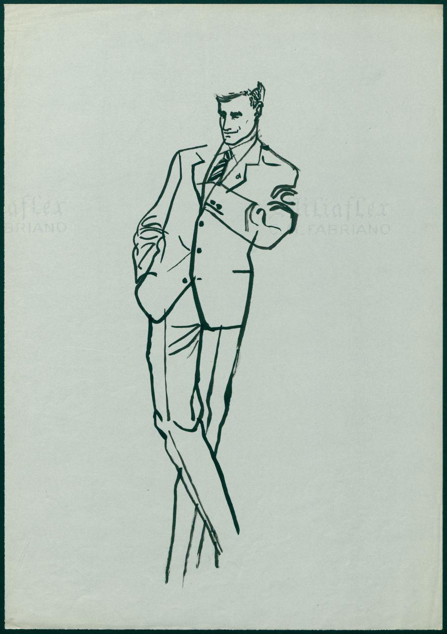 Disegno per annuncio pubblicitario per il reparto Uomo Moda maschile dei grandi magazzini la Rinascente. uomo in posa con abito elegante