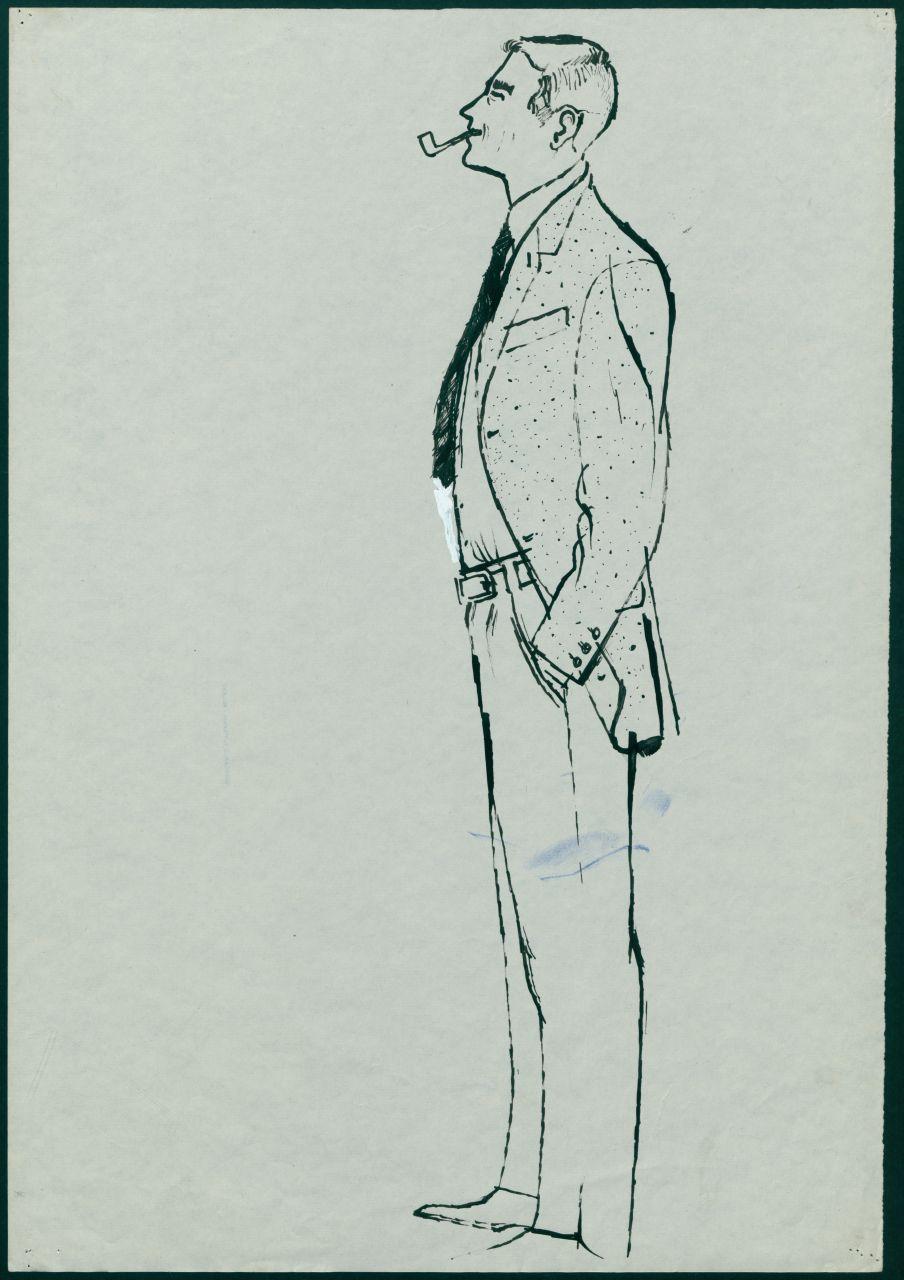 Disegno per annuncio pubblicitario per il reparto Uomo Moda maschile dei grandi magazzini la Rinascente. uomo in posa con abito elegante e pipa