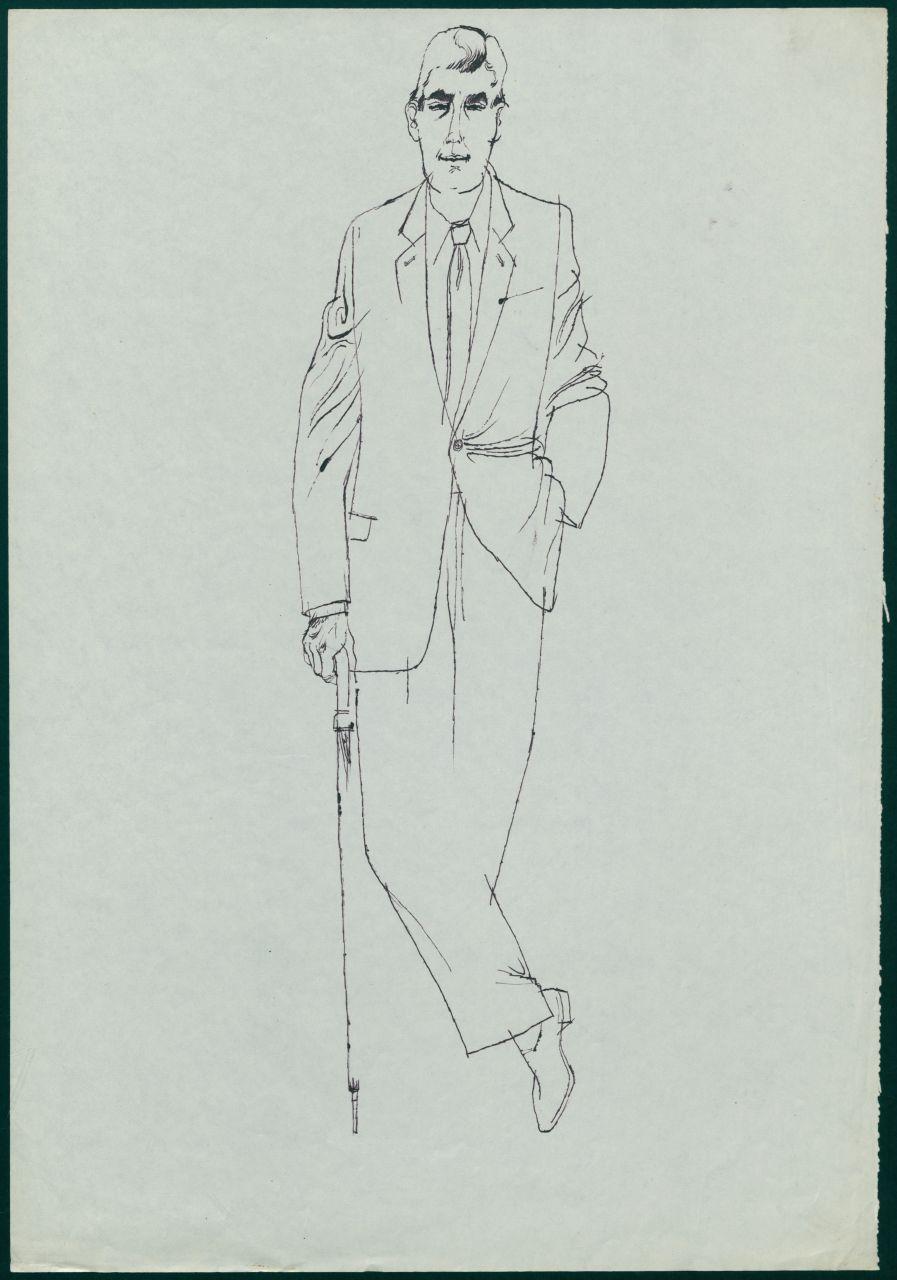 Disegno per annuncio pubblicitario per il reparto Uomo Moda maschile dei grandi magazzini la Rinascente. uomo in posa con abito elegante e bastone da passeggio