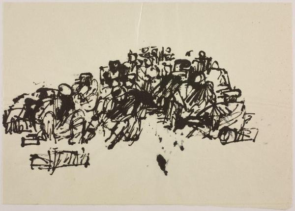 - NOTIZIE STORICO CRITICHE "Serie di immagini rapide, di strutture elastiche, in cui il peso diverso dei neri, e la composizione stabiliscono di volta in volta un movimentato equilibrio" [...] "Questi segni ci rivelano una trama di significati. File di elmetti, mani e bastoni alzati, braccia in atto di scagliare. Non simboli, ma qualcosa come la forma culminante di una situazione umana" [...] "In questi disegni qualcosa sta accadendo. Così non offrono un dato alla memoria, ma un oggetto all'emozione". Citazioni tratte dalla presentazione di Emilio Tadini alla mostra di disegni di Giancarlo Iliprandi alla Libreria Salto di Milano, 1961. L'ampio ciclo di disegni è stimolato dalla strage di Reggio Emilia del 7 luglio 1960, quando durante una manifestazione sindacale le violenze delle forze dell'ordine portarono alla morte di cinque operai. L'evento e l'ampio numero dei poliziotti impiegati, più di trecento, portarono Iliprandi a interrogarsi sulla violenza in una serie di disegni che sembrano seguire la radiocronaca dell'evento, con "movimenti di macchina" che si avvicinano e allontanano di continuo dalle scene del tumulto, focalizzandosi sulle masse, vuoi dei militari vuoi dei manifestanti, così come sui corpi a terra dei feriti e dei morti. Il disegno a china su carta di riso evidenzia l'urgenza espressiva e le possibilità drammatiche, evidenti soprattutto quando la scena è ridotta a poche chiazze d'inchiostro, oppure agli ultimi movimenti convulsi di un corpo disteso a terra. Scene di cronaca che evocano al contempo momenti universali e fuori dal tempo riferendosi più in generale alle lotte e alle violenze di tutti i tempi. L'ampio ciclo di disegni è realizzato per una mostra alla Libreria Salto di Milano. Da questa serie di opere Iliprandi ricava anche una più ampia riflessione sul rapporto tra grafica e disegno creando una sequenza d'immagini introdotta da un breve testo. Un materiale che sembrerebbe costituire una sezione speciale della stessa mostra: "sezione inutile per quanti sono esperti di codeste cose, militano in questo campo, ma utile forse per i profani, che sono sempre la maggioranza e che sanno così poco del nostro lavoro di ricerca". Lo stesso testo con una selezione d'immagini è poi pubblicato sulla rivista "Serigrafia" nel maggio-giugno 1963 con il titolo "Incontro fra la grafica e il disegno". Dopo un decennio di esperienze professionali dove la pittura e il disegno si intersecano con la grafica e la fotografia, Iliprandi crede di dover mettere a punto qualche considerazione, probabilmente stimolato anche nel vedere alla propria mostra una certa incapacità di leggere criticamente il disegno e constatare una sempre maggiore richiesta di specializzazione professionale.