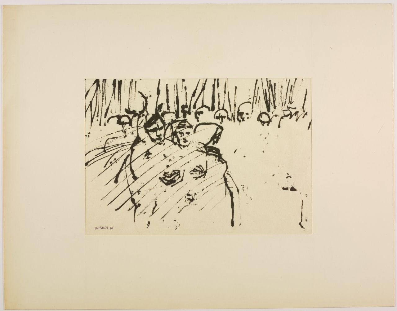 - NOTIZIE STORICO CRITICHE "Serie di immagini rapide, di strutture elastiche, in cui il peso diverso dei neri, e la composizione stabiliscono di volta in volta un movimentato equilibrio" [...] "Questi segni ci rivelano una trama di significati. File di elmetti, mani e bastoni alzati, braccia in atto di scagliare. Non simboli, ma qualcosa come la forma culminante di una situazione umana" [...] "In questi disegni qualcosa sta accadendo. Così non offrono un dato alla memoria, ma un oggetto all'emozione". Citazioni tratte dalla presentazione di Emilio Tadini alla mostra di disegni di Giancarlo Iliprandi alla Libreria Salto di Milano, 1961. L'ampio ciclo di disegni è stimolato dalla strage di Reggio Emilia del 7 luglio 1960, quando durante una manifestazione sindacale le violenze delle forze dell'ordine portarono alla morte di cinque operai. L'evento e l'ampio numero dei poliziotti impiegati, più di trecento, portarono Iliprandi a interrogarsi sulla violenza in una serie di disegni che sembrano seguire la radiocronaca dell'evento, con "movimenti di macchina" che si avvicinano e allontanano di continuo dalle scene del tumulto, focalizzandosi sulle masse, vuoi dei militari vuoi dei manifestanti, così come sui corpi a terra dei feriti e dei morti. Il disegno a china su carta di riso evidenzia l'urgenza espressiva e le possibilità drammatiche, evidenti soprattutto quando la scena è ridotta a poche chiazze d'inchiostro, oppure agli ultimi movimenti convulsi di un corpo disteso a terra. Scene di cronaca che evocano al contempo momenti universali e fuori dal tempo riferendosi più in generale alle lotte e alle violenze di tutti i tempi. L'ampio ciclo di disegni è realizzato per una mostra alla Libreria Salto di Milano. Da questa serie di opere Iliprandi ricava anche una più ampia riflessione sul rapporto tra grafica e disegno creando una sequenza d'immagini introdotta da un breve testo. Un materiale che sembrerebbe costituire una sezione speciale della stessa mostra: "sezione inutile per quanti sono esperti di codeste cose, militano in questo campo, ma utile forse per i profani, che sono sempre la maggioranza e che sanno così poco del nostro lavoro di ricerca". Lo stesso testo con una selezione d'immagini è poi pubblicato sulla rivista "Serigrafia" nel maggio-giugno 1963 con il titolo "Incontro fra la grafica e il disegno". Dopo un decennio di esperienze professionali dove la pittura e il disegno si intersecano con la grafica e la fotografia, Iliprandi crede di dover mettere a punto qualche considerazione, probabilmente stimolato anche nel vedere alla propria mostra una certa incapacità di leggere criticamente il disegno e constatare una sempre maggiore richiesta di specializzazione professionale.