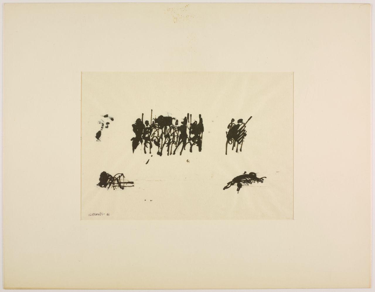 Disegno per mostra allestita alla Libreria Salto di Milano, 1961. truppa di militari, corpi riversi a terra