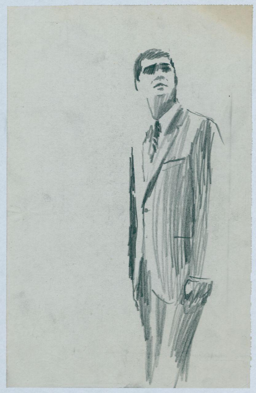 Disegno per annuncio pubblicitario per il reparto Uomo Moda maschile dei grandi magazzini la Rinascente. uomo con completo classico