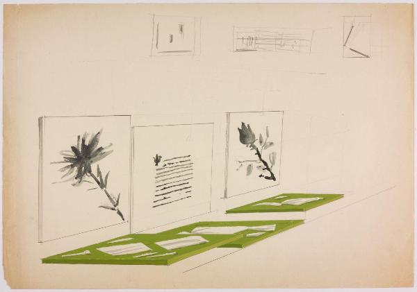 Bozzetto per vetrina ai grandi magazzini la Rinascente. pannelli illustrativi per allestimento