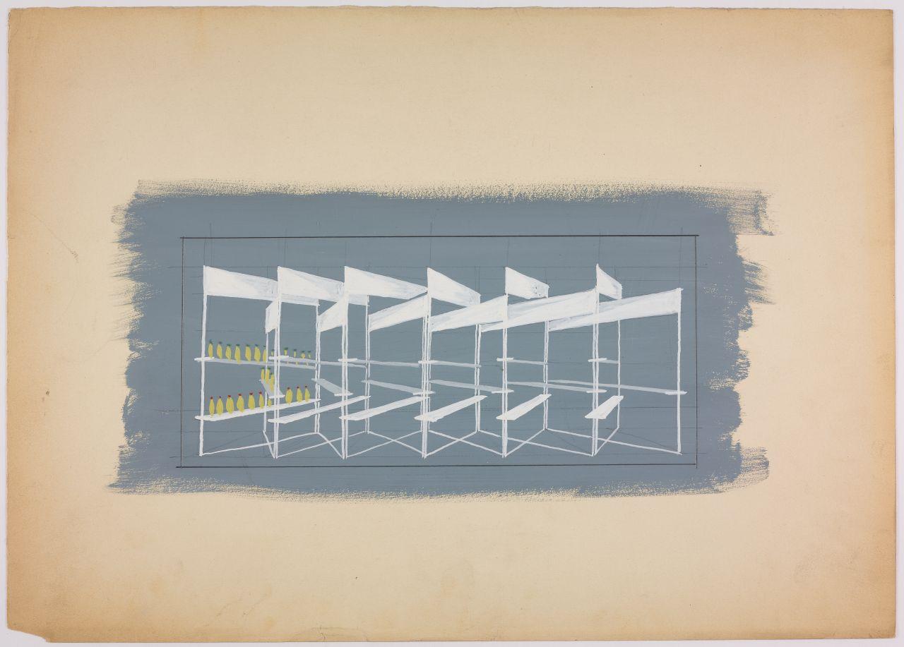 Bozzetto per vetrina ai grandi magazzini la Rinascente. strutture mobili per allestimento