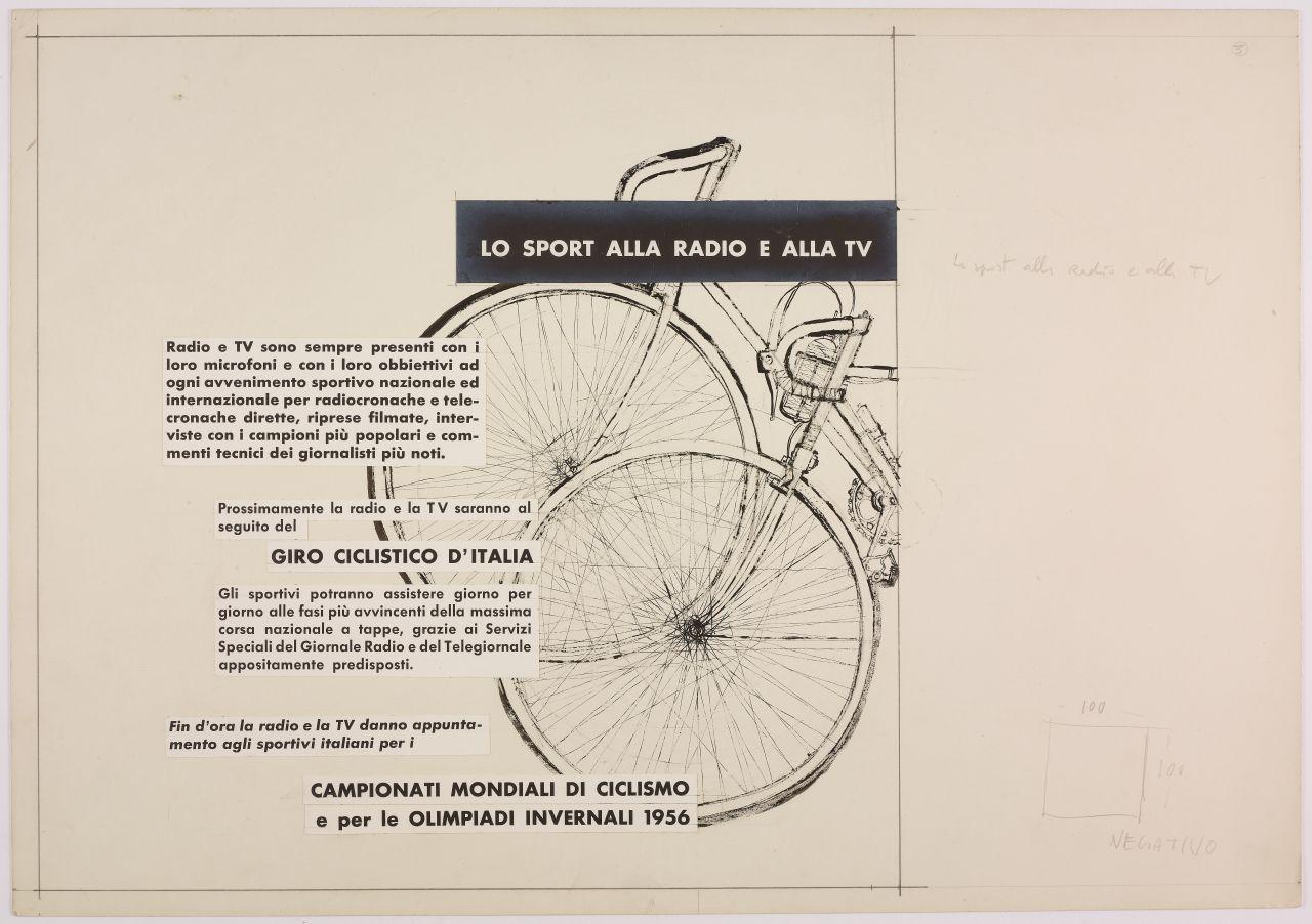 - NOTIZIE STORICO CRITICHE Esecutivo per pannello eseguito da Giancarlo Iliprandi per l' uditorio RAI alla Fiera Campionaria di Milano, 1955.\nLe collaborazioni con i fratelli Castiglioni per i padiglioni RAI per la Fiera Campionaria di Milano sono essenziali per gli esordi professionali di Iliprandi che in quelle occasioni, all'inizio degli anni cinquanta, grazie alla conoscenza di Max Huber scopre l'importanza della grafica e della tipografia. Trattandosi di una collaborazione duratura, gli interventi per i padiglioni RAI seguono l'evolversi della sua ricerca grafica, inizialmente come pittore-illustratore, poi con interventi sulla fotografia come per il padiglione per le Olimpiadi di Roma del 1960 dove tratta le foto d'agenzia con contrasti di stampa e retini rendendole grafiche.