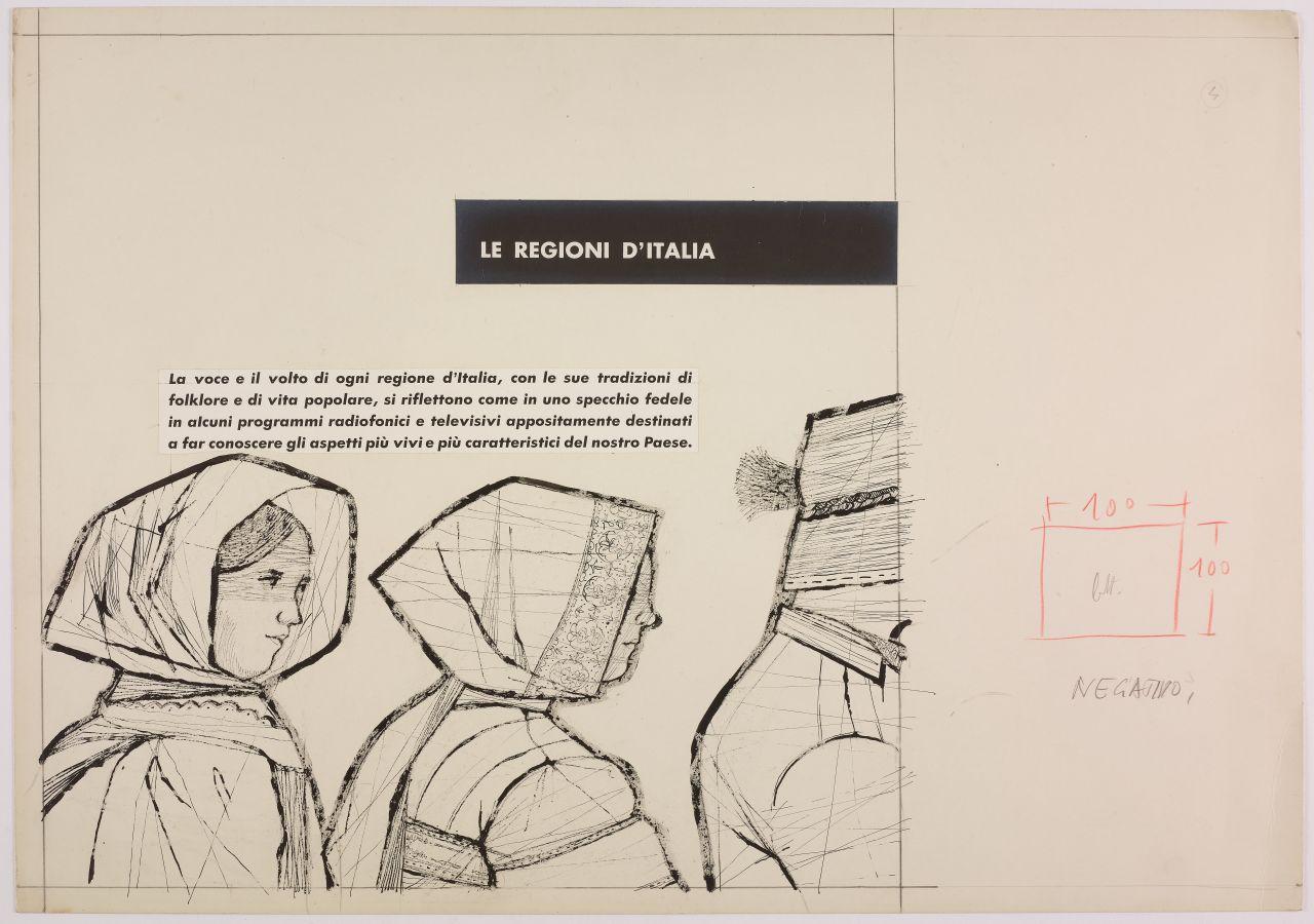 Esecutivo per pannello per auditorio Rai - Radiotelevisione Italiana alla Fiera Campionaria di Milano. donne in abiti tradizionali