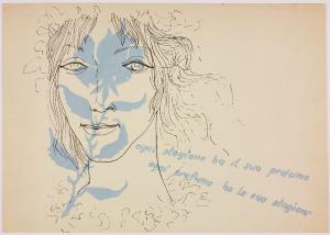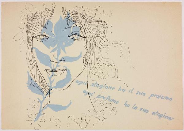 Disegno a colori eseguito con pittura a tempera, inchiostro a penna e grafite su cartoncino con iscrizioni manoscritte.