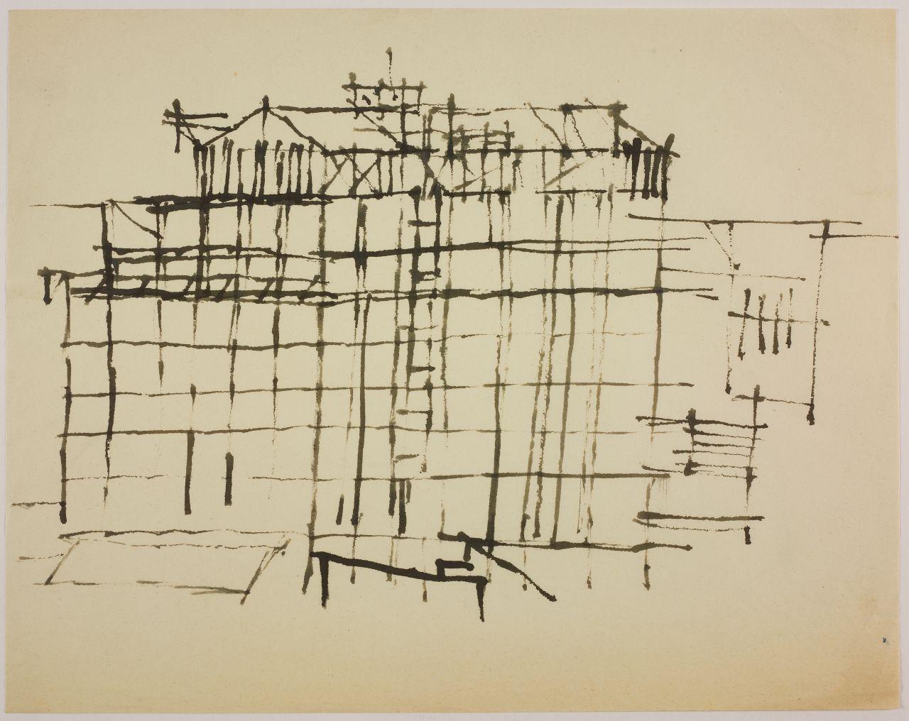 - NOTIZIE STORICO CRITICHE Nel gennaio 1958 Giancarlo Iliprandi espone i suoi dipinti della serie Case e cantieri alla Galleria dell'Ariete a Milano per cui viene pubblicato il ventinovesimo catalogo della Galleria con testo dell'amico e collega pittore Emilio Tadini. La pittura di Iliprandi registrava la rinascita e l'espansione urbanistica della Milano dell'immediato secondo dopoguerra, che Iliprandi segue con interesse, soprattutto riguardo la zona dove abita (via Ampere 55) allora interessata dal cantiere della nuova Facoltà di Architettura così come del palazzo di Gio Ponti in via Vallazze 63 dove il giovane acquista un appartamento e si trasferisce nel dicembre 1957.