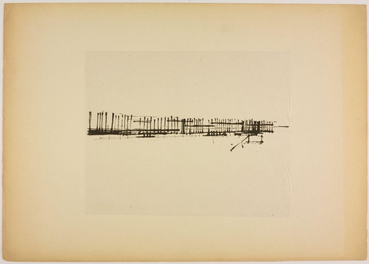 Disegno in bianco e nero eseguito con inchiostro di china su foglio di carta di riso montato su cartoncino.