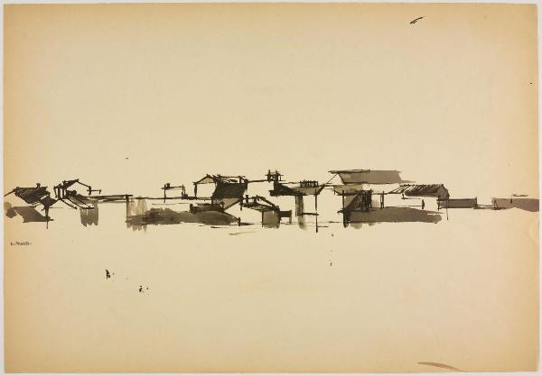 - NOTIZIE STORICO CRITICHE Nel gennaio 1958 Giancarlo Iliprandi espone i suoi dipinti della serie Case e cantieri alla Galleria dell'Ariete a Milano per cui viene pubblicato il ventinovesimo catalogo della Galleria con testo dell'amico e collega pittore Emilio Tadini. La pittura di Iliprandi registrava la rinascita e l'espansione urbanistica della Milano dell'immediato secondo dopoguerra, che Iliprandi segue con interesse, soprattutto riguardo la zona dove abita (via Ampere 55) allora interessata dal cantiere della nuova Facoltà di Architettura così come del palazzo di Gio Ponti in via Vallazze 63 dove il giovane acquista un appartamento e si trasferisce nel dicembre 1957.
