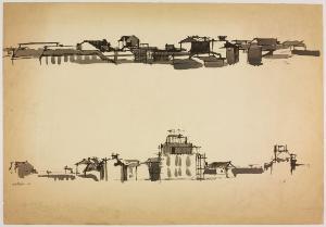 - NOTIZIE STORICO CRITICHE Nel gennaio 1958 Giancarlo Iliprandi espone i suoi dipinti della serie Case e cantieri alla Galleria dell'Ariete a Milano per cui viene pubblicato il ventinovesimo catalogo della Galleria con testo dell'amico e collega pittore Emilio Tadini. La pittura di Iliprandi registrava la rinascita e l'espansione urbanistica della Milano dell'immediato secondo dopoguerra, che Iliprandi segue con interesse, soprattutto riguardo la zona dove abita (via Ampere 55) allora interessata dal cantiere della nuova Facoltà di Architettura così come del palazzo di Gio Ponti in via Vallazze 63 dove il giovane acquista un appartamento e si trasferisce nel dicembre 1957.