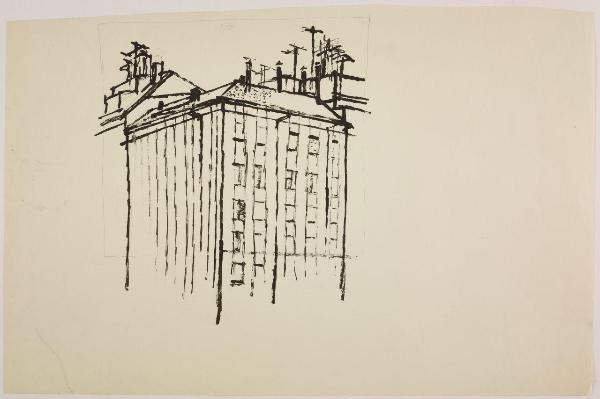 - NOTIZIE STORICO CRITICHE Nel gennaio 1958 Giancarlo Iliprandi espone i suoi dipinti della serie Case e cantieri alla Galleria dell'Ariete a Milano per cui viene pubblicato il ventinovesimo catalogo della Galleria con testo dell'amico e collega pittore Emilio Tadini. La pittura di Iliprandi registrava la rinascita e l'espansione urbanistica della Milano dell'immediato secondo dopoguerra, che Iliprandi segue con interesse, soprattutto riguardo la zona dove abita (via Ampere 55) allora interessata dal cantiere della nuova Facoltà di Architettura così come del palazzo di Gio Ponti in via Vallazze 63 dove il giovane acquista un appartamento e si trasferisce nel dicembre 1957.