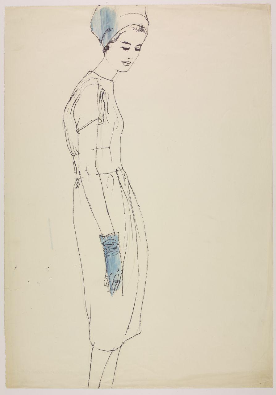 Bozzetto per il reparto Donna Moda femminile dei grandi magazzini la Rinascente. donna con cappello e guanti coordinati