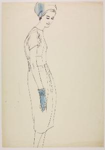 Disegno a grafite, pennarello e inchiostro nero realizzato su un foglio di carta bianca. Acquerellatura azzurra in corrispondenza del cappello e del guanto.