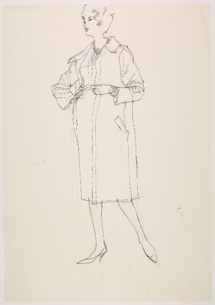 Bozzetto per il reparto Donna Moda femminile dei grandi magazzini la Rinascente. donna con soprabito