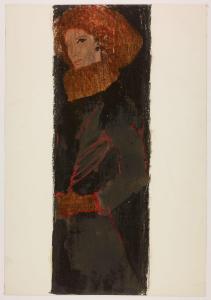 Bozzetto per pannello del reparto Donna Moda femminile dei grandi magazzini la Rinascente. donna con abito nero