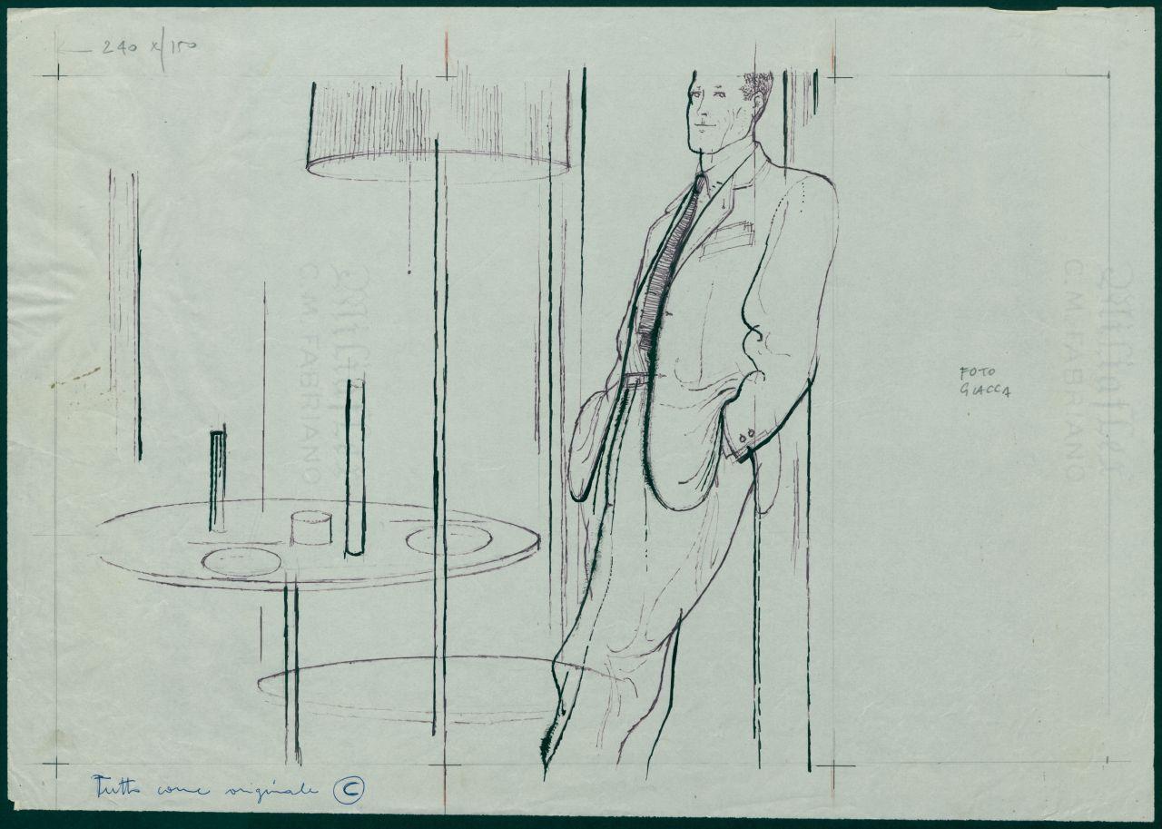 Bozzetto per pannello del reparto Uomo Moda maschile dei grandi magazzini la Rinascente. uomo con completo classico in un interno