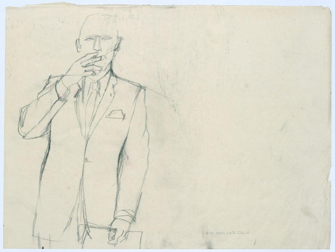 Bozzetto di moda maschile per i grandi magazzini la Rinascente. uomo con giacca monopetto