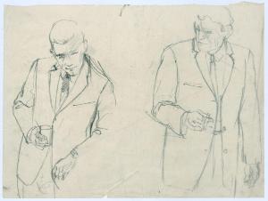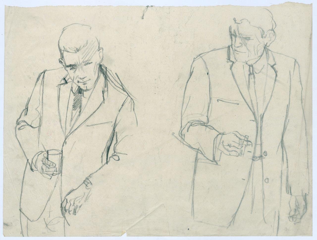 Bozzetto di moda maschile per i grandi magazzini la Rinascente. uomo con giacca monopetto e bicchiere