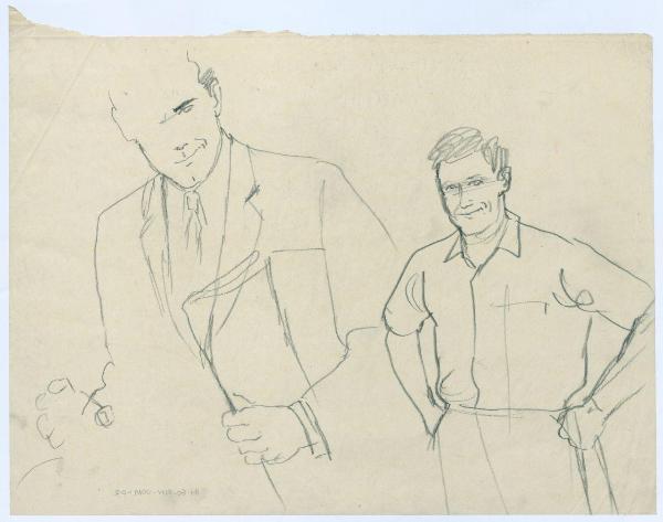 Bozzetto di moda maschile per i grandi magazzini la Rinascente. uomo con giacca monopetto e giornale e uomo in camicia