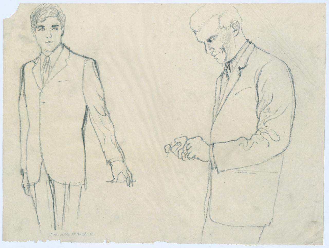 Bozzetto di moda maschile per i grandi magazzini la Rinascente. uomini con giacca monopetto e sigaretta