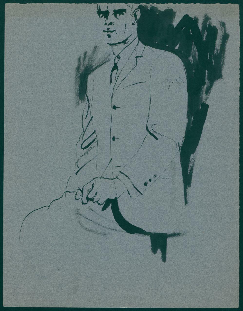 Bozzetto di moda maschile per i grandi magazzini la Rinascente. uomo con giacca monopetto