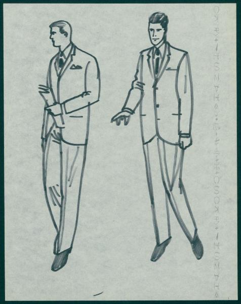 Bozzetto di moda maschile per i grandi magazzini la Rinascente. uomini con completi classici