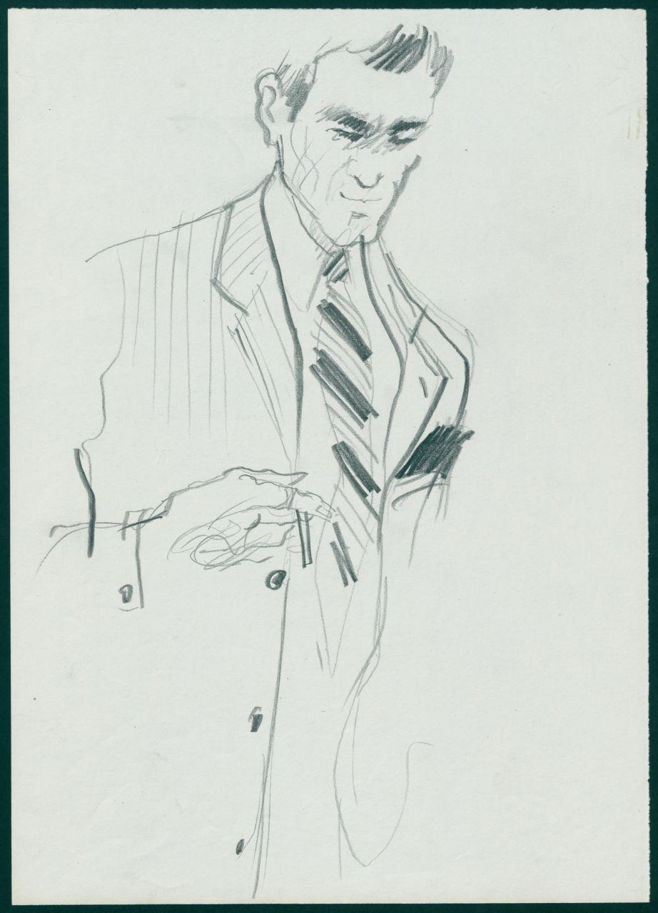 Bozzetto di moda maschile per i grandi magazzini la Rinascente. uomo con giacca a righe, cravatta regimental e pochette