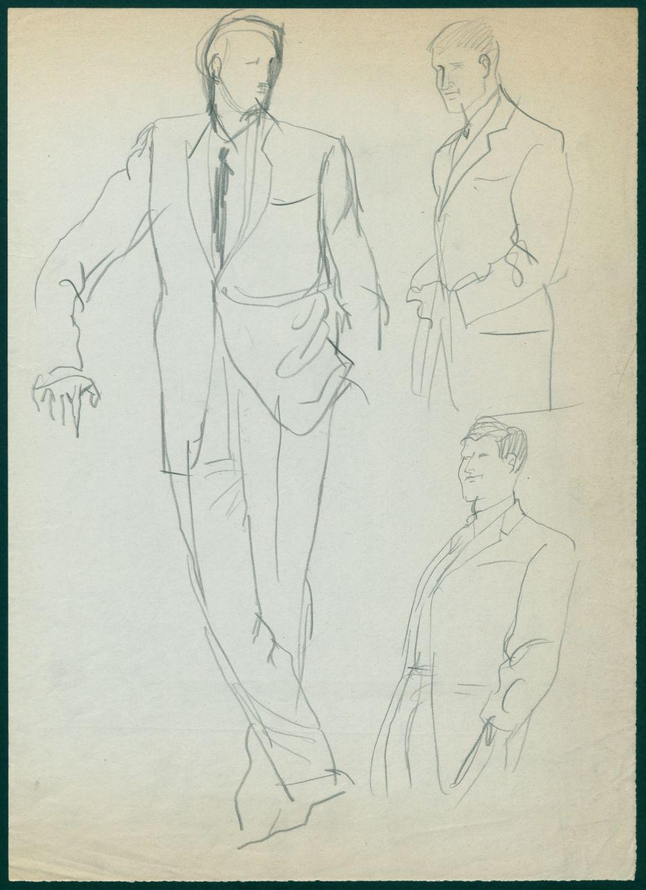 Bozzetto di moda maschile per i grandi magazzini la Rinascente. uomini con completo e giacche monopetto