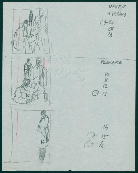Schizzi per il periodico dei grandi magazzini la Rinascente "Uomo la Rinascente Moda maschile" dell'ottobre 1961. riquadri con figure umane e note manoscritte