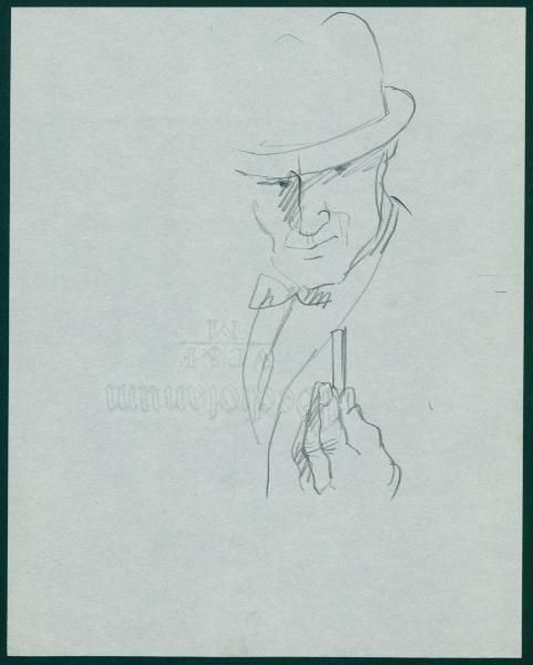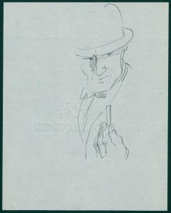 Bozzetto per il periodico dei grandi magazzini la Rinascente "Uomo la Rinascente Moda maschile" dell'ottobre 1961. mezzobusto di uomo con cappello, papillon e sigaretta