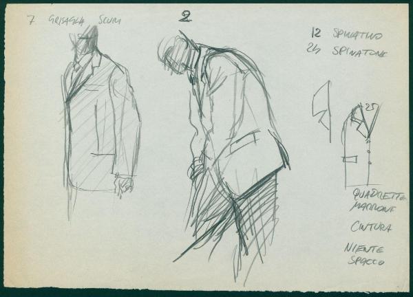 Bozzetto per il periodico dei grandi magazzini la Rinascente "Uomo la Rinascente Moda maschile" dell'ottobre 1961. dettagli di uomini con giacca monopetto