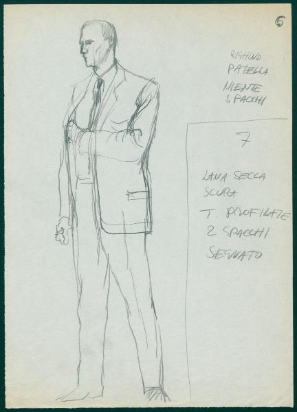 Bozzetto per il periodico dei grandi magazzini la Rinascente "Uomo la Rinascente Moda maschile" dell'ottobre 1961. uomo con completo con giacca monopetto