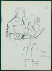 Bozzetto per il periodico dei grandi magazzini la Rinascente "Uomo la Rinascente Moda maschile" dell'ottobre 1961. uomo seduto con soprabito e dettaglio del soprabito