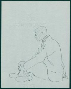 Bozzetto per il periodico dei grandi magazzini la Rinascente "Uomo la Rinascente Moda maschile" dell'ottobre 1961. figura maschile di profilo seduta a terra