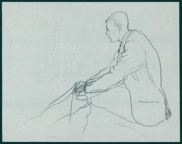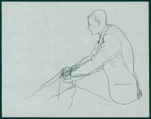Bozzetto per il periodico dei grandi magazzini la Rinascente "Uomo la Rinascente Moda maschile" dell'ottobre 1961. figura maschile di profilo seduta a terra