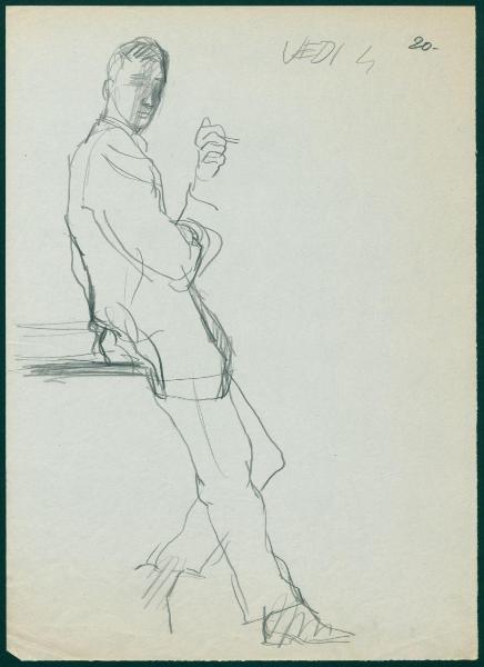 Bozzetto per il periodico dei grandi magazzini la Rinascente "Uomo la Rinascente Moda maschile" dell'ottobre 1961. figura maschile appoggiata con completo e sigaretta