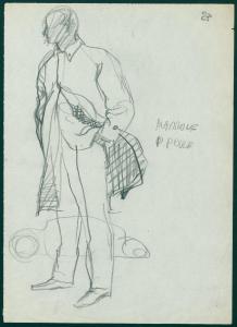 Bozzetto per il periodico dei grandi magazzini la Rinascente "Uomo la Rinascente Moda maschile" dell'ottobre 1961. figura maschile con soprabito