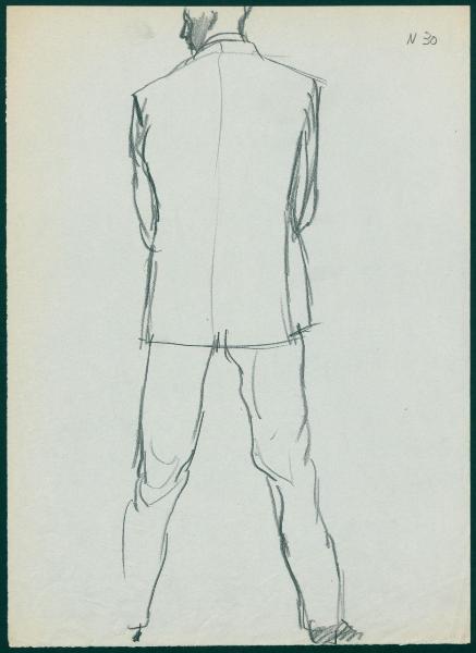 Bozzetto per il periodico dei grandi magazzini la Rinascente "Uomo la Rinascente Moda maschile" dell'ottobre 1961. figura maschile di spalle con completo